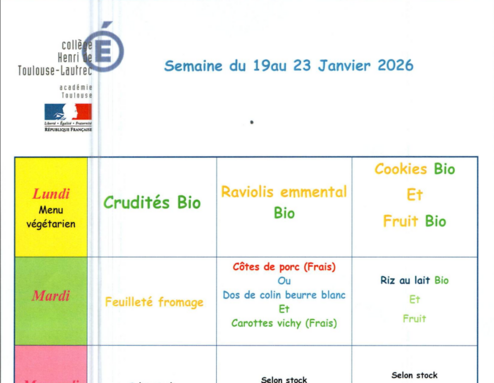 Cantine : menu du 12 au 16 janvier 2026