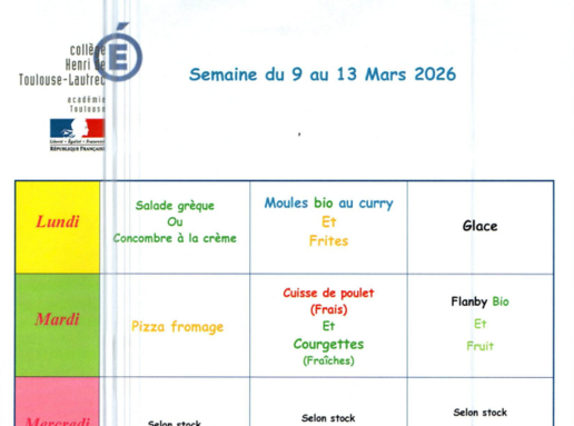 Cantine : menu 9 au 13 mars
